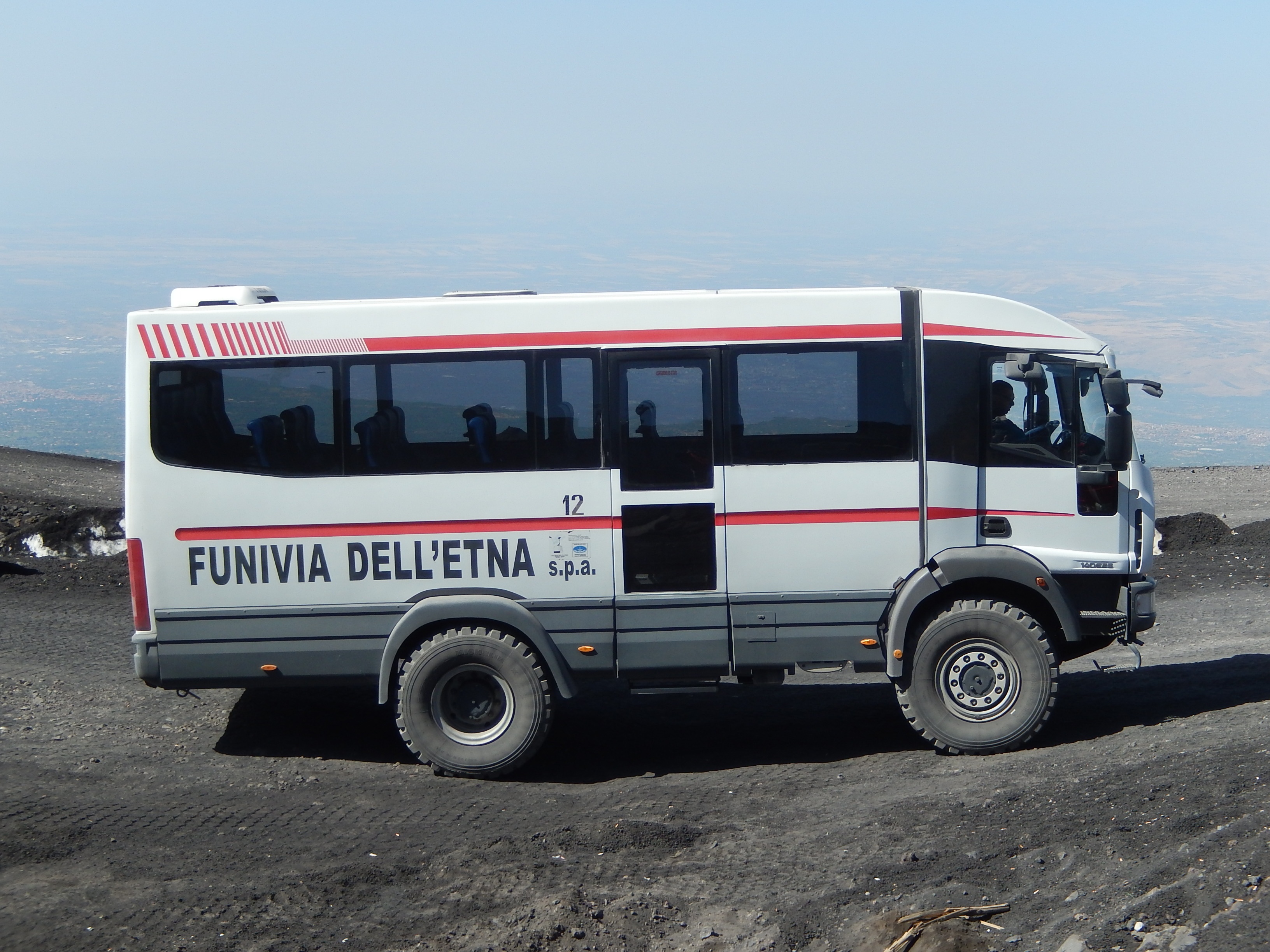 Our overnight stop was at Catania, a major provincial city lying in the shadow of Mount Etna. Bill and I are taking the excursion to the top. Our coach takes us to 1900metres, where we transfer to a cablecar to get us up to 2500 metres. The area is a moonscape of pebbles and snow, covered in grey-black ash. Our coach drives past an old molten flow, it looks as if someone has upset a pot of tar or road bitumin. Mount Etna – which is a ‘he’ according to Franco – is still very active, venting every few weeks. The last major eruptions were in 2001 and 2002. We transfer again, this time to a Mercedes Benz Unimog – a strange looking vehicle transporter which looks like something you would use in the snow, or even on the moon.