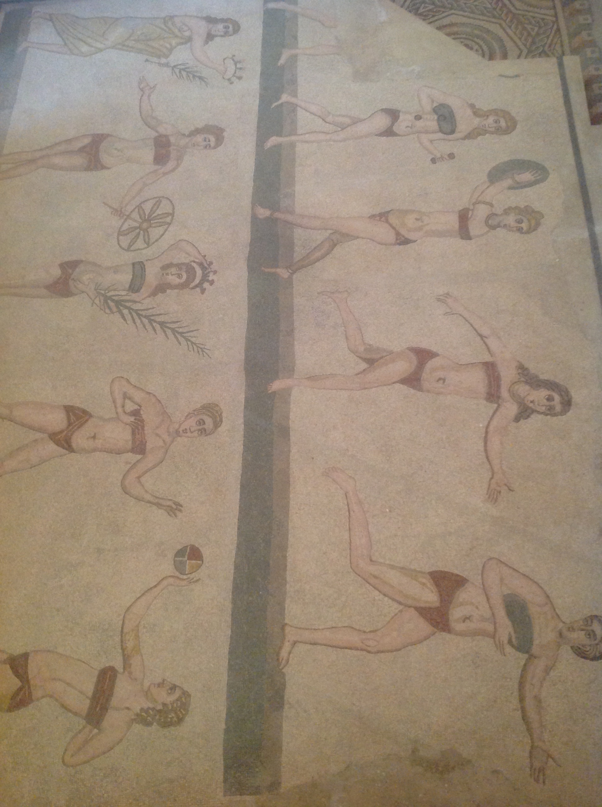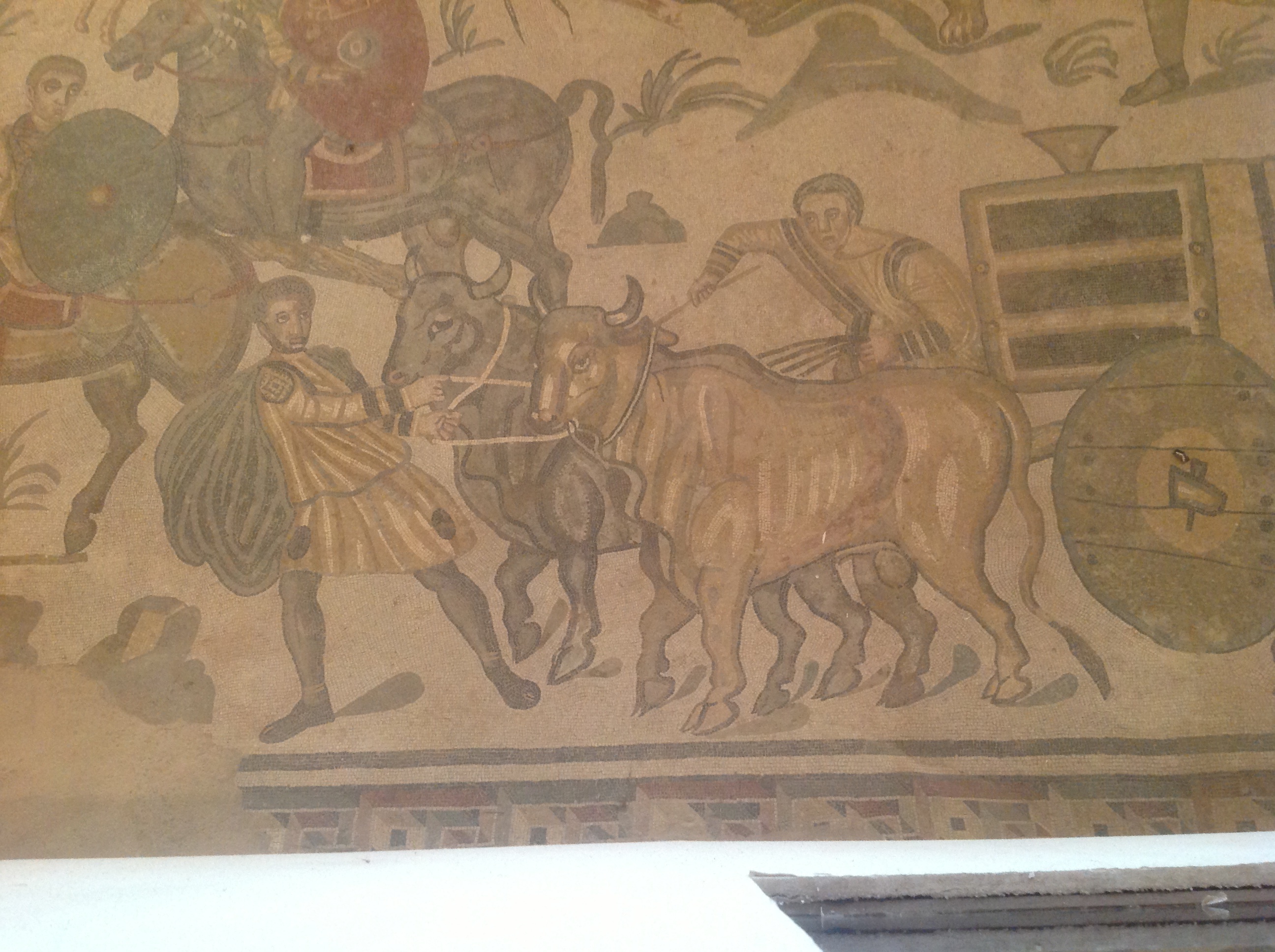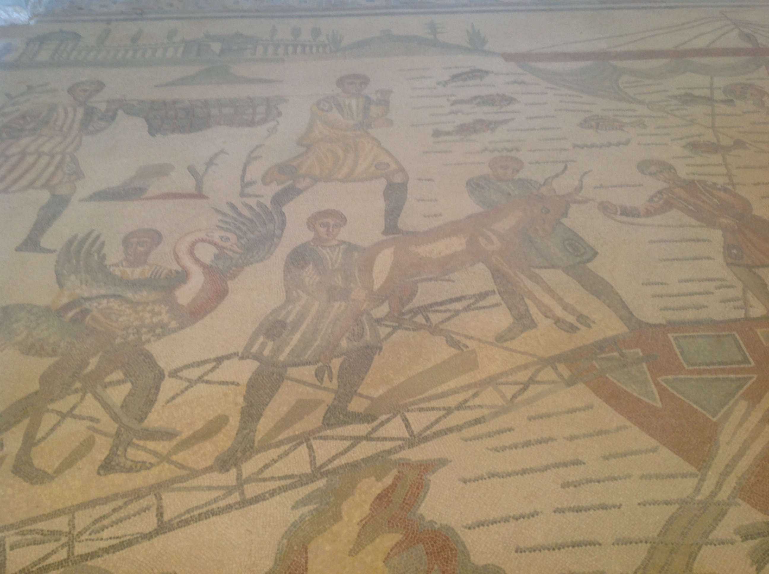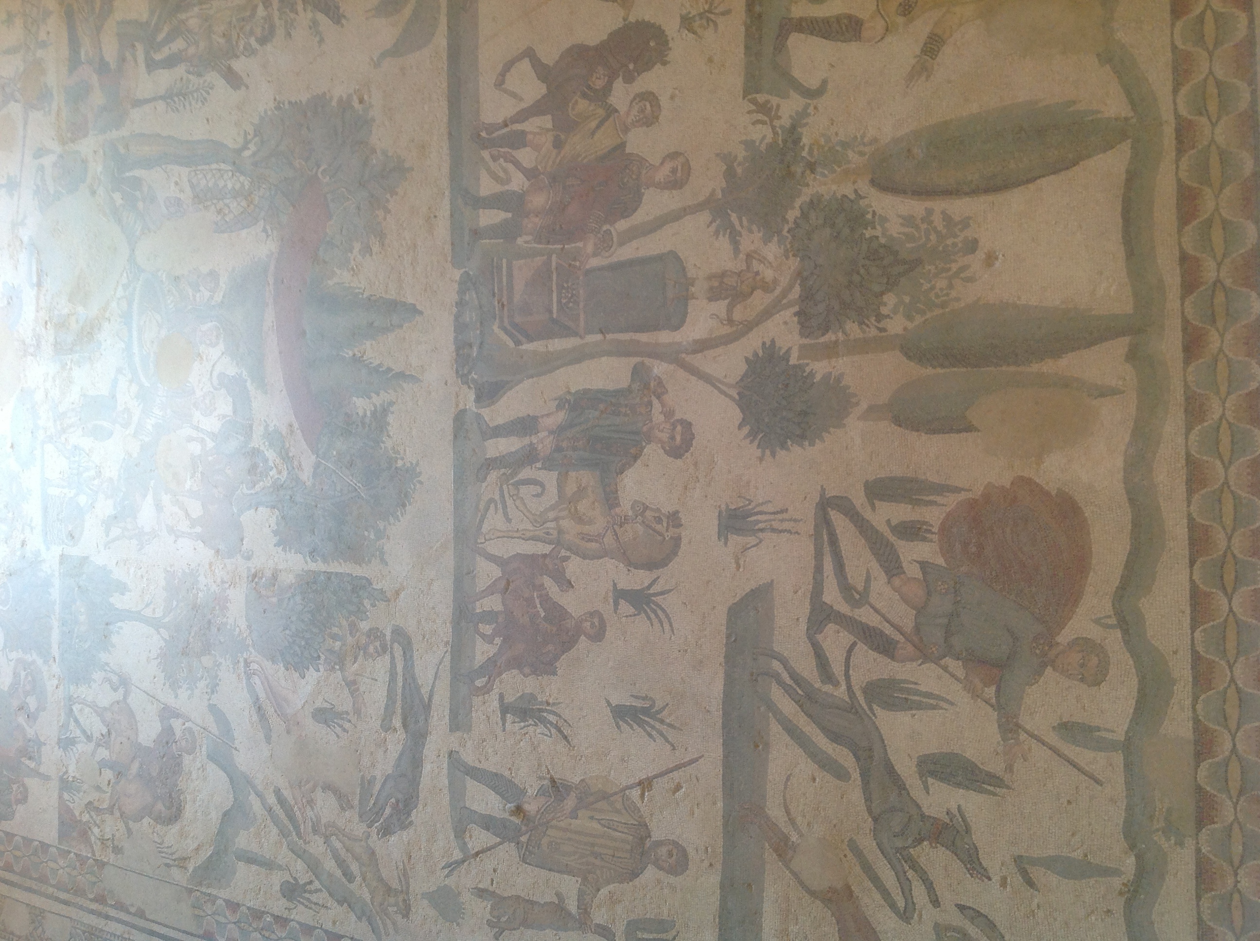 When we arrived at our next destination, The Villa Romana del Casale in Piazza Armerina, I had another cretin moment. The itinerary described the stop as the richest, largest and most complex collection of late Roman mosaics in the world. Itineraries always talk up what you will see, but if I had done a little research, I would have given it more credence. We were allowed an hour, that was just enough time to scratch the surface. It is a huge Roman villa, massive, and still in such good condition that it is not difficult to imagine the life that went on here. They must have had a lot of servants – slaves actually. There are more than 3500 minuscule mosaic tiles decorating the floors of every room. Each design suggests the use for the room, numerous well depicted sign boards help the ignorant (i.e. ME) to understand the significance. The mosaics are well maintained, entire in many places, and here and there wall frescoes are still faintly visible. Bill and I have seen Roman ruins and villas before, and of course the memory fades, but we both agree this is the most outstanding and impressive we have seen. Well worth the trip to Sicily! I hope the photos tell the story. I had to take them on the iPad as the camera battery went flat -again! – just as we arrived.
