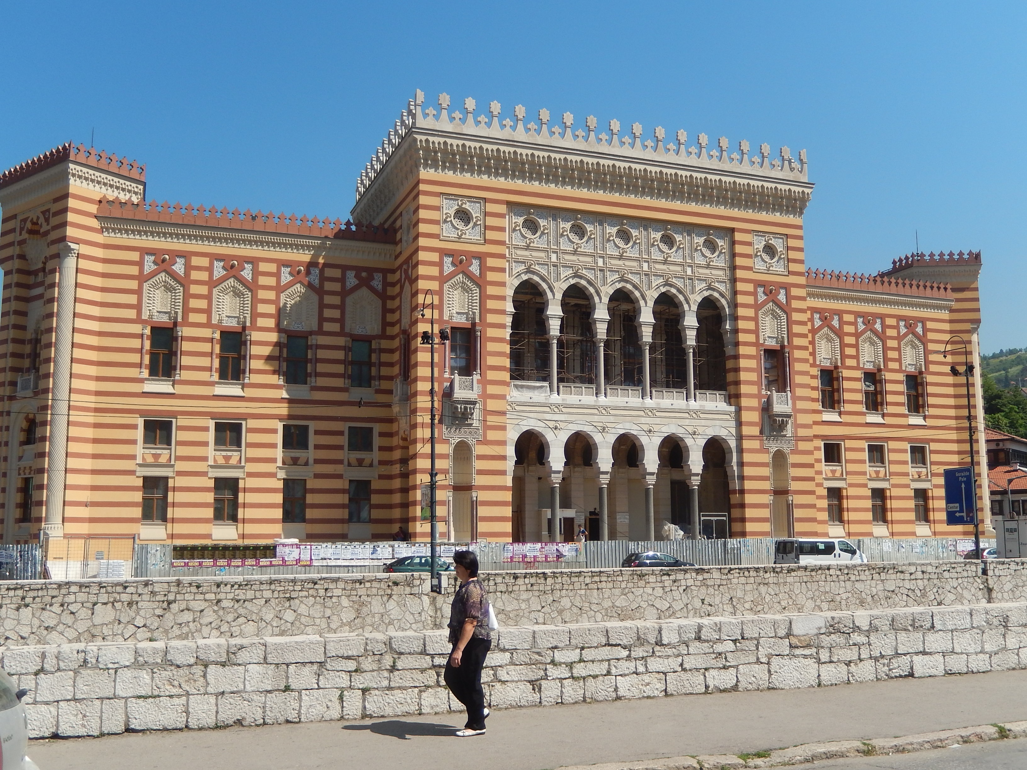 About 80% of the city has been rebuilt, however some buildings pose special challenges. The city hall was built in 1896 by the Austro-Hungarian empire, and in a sign of unity, it combined Baroque with Moorish architecture. It became the city library after WWII, housing important and ancient books; and it was one of the first targets of the Bosnian war, in an attempt to hurt the culture of the city. To rebuild this building in its original style requires artisan skills that are no longer readily available. Elza told us that when the city acquired the site in the 1890’s, one homeowner refused to sell, on the grounds that it had been the family home for generations. Eventually the city fathers agreed to deconstruct the house block by block, and re-assemble it across the road. That house is still owned by the same family and run as a restaurant called the Inat Kuca – the stubborn house or House of Spite.