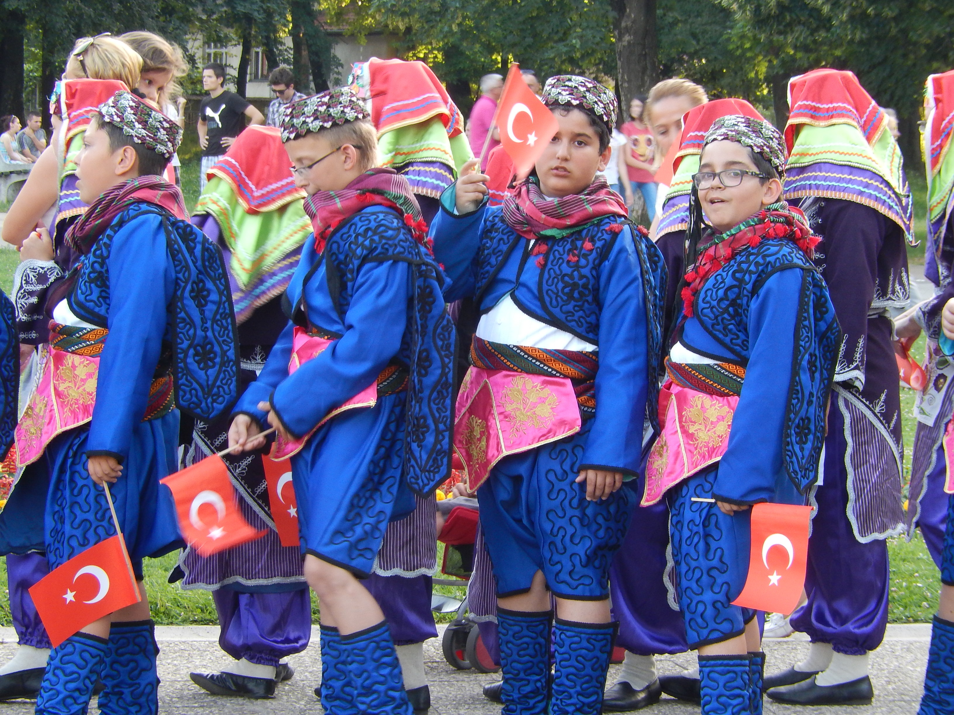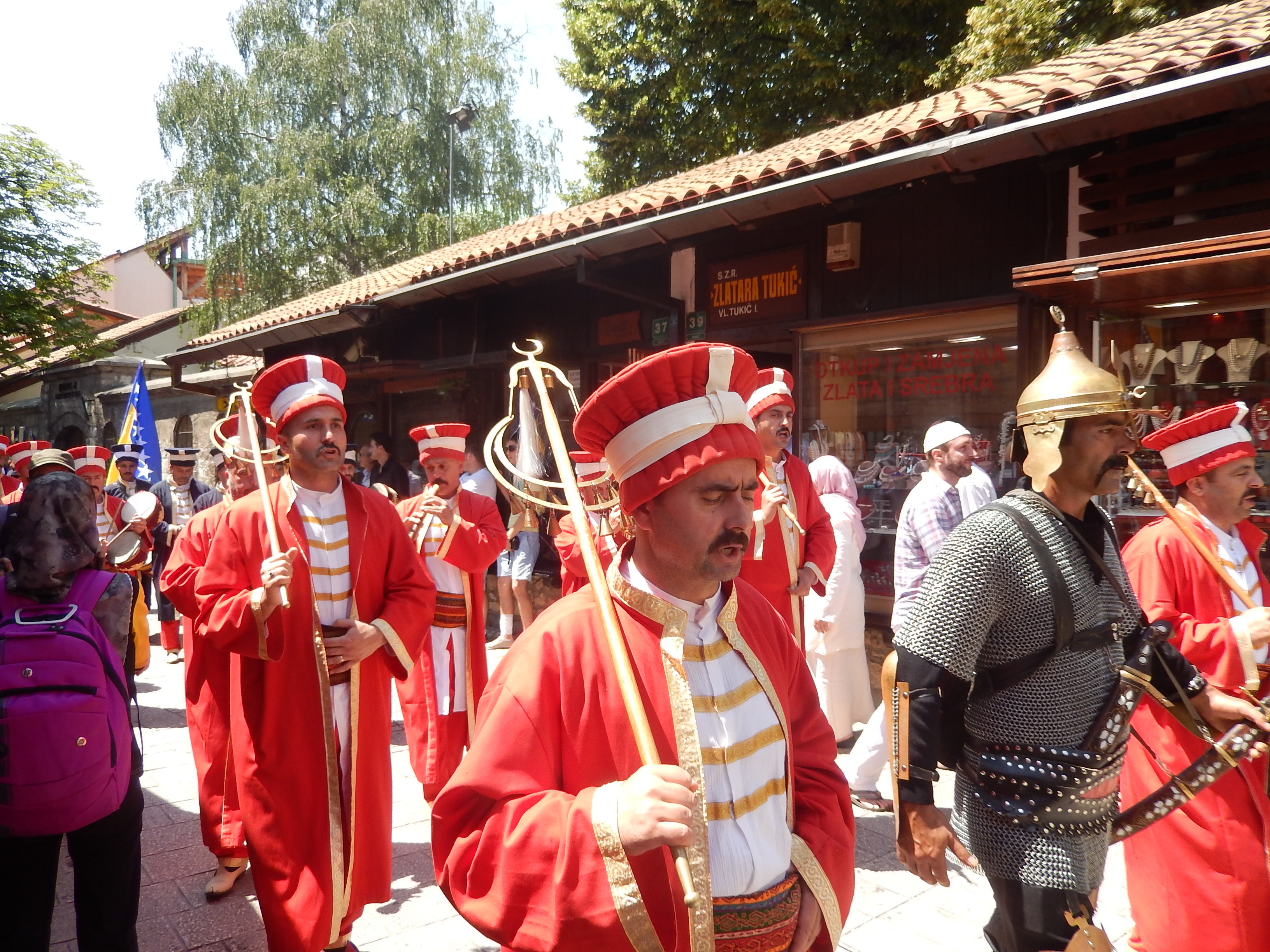 Later that afternoon, as Bill and I are wandering the old town, we hear the sound of a drum and brass band coming from the Bey Mosque (Gazi Husrev Bey’s Mosque) the main mosque in town, the one that is near our hotel. It is not your standard British brass band, imagethese men are playing ancient instruments, and dressed in a style from another era. We have no idea what the celebration is for, but we manage to jump on to the procession and mingle with the crowd for a moment.