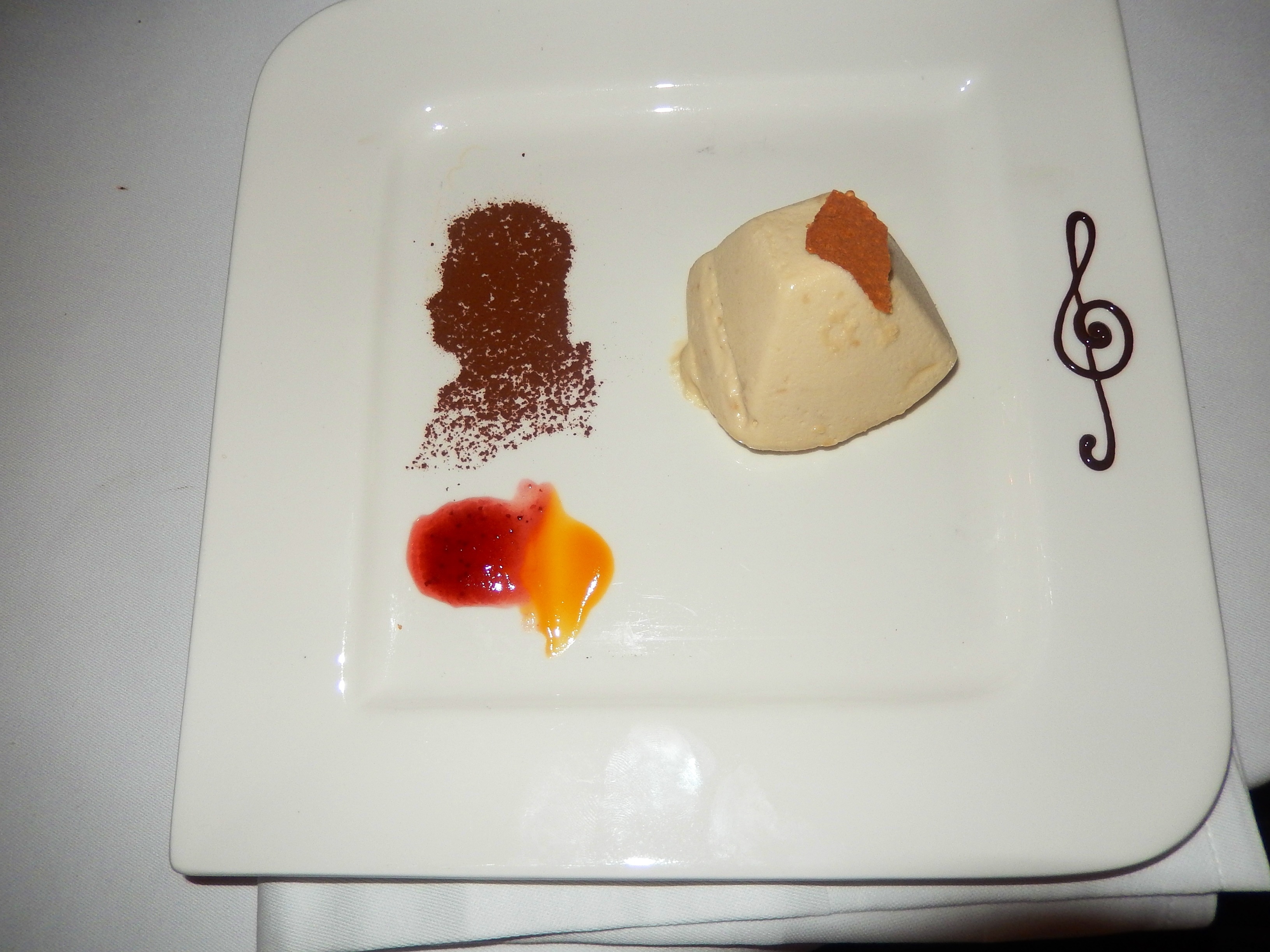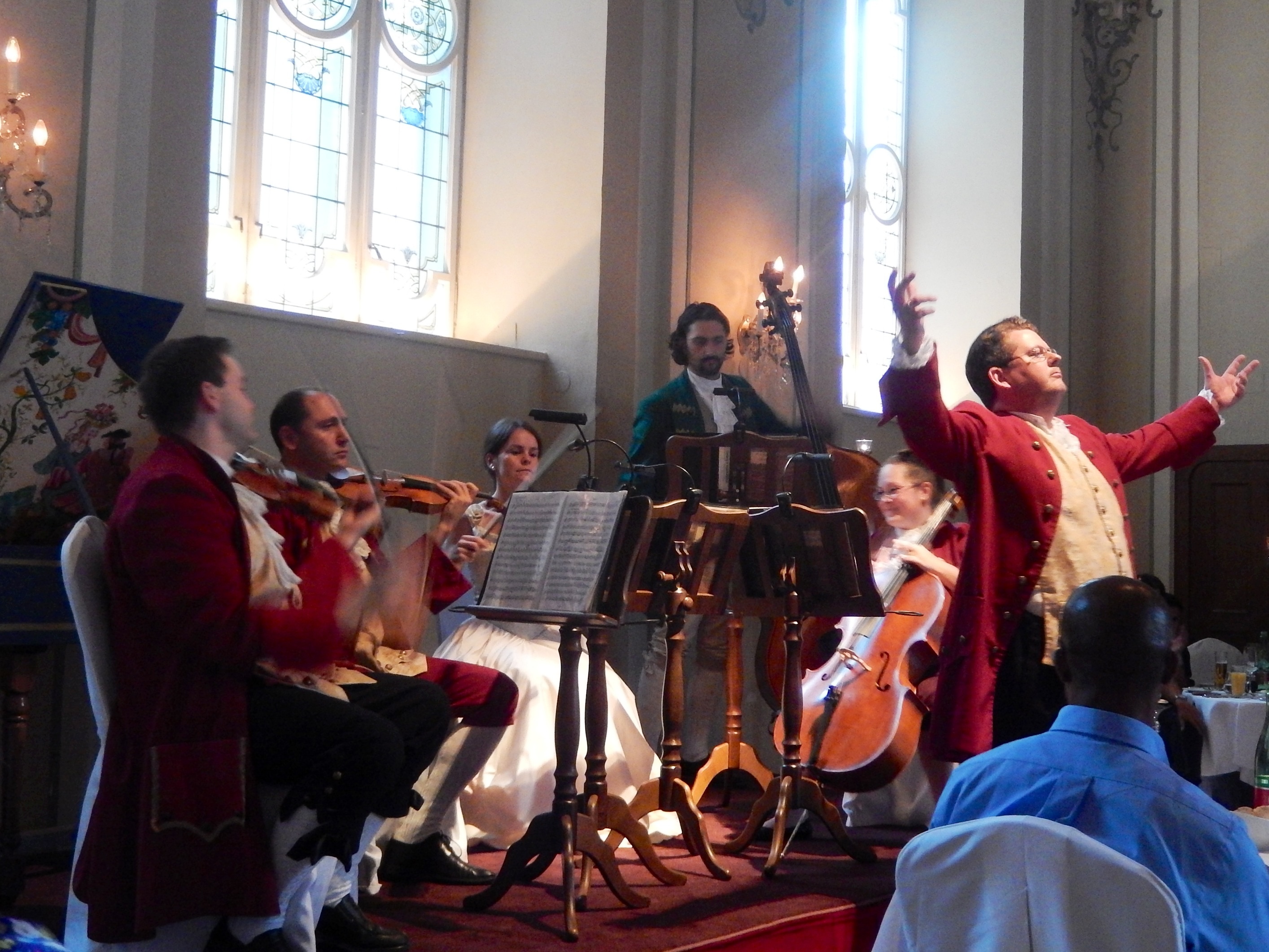 of Figaro and The Magic Flute. They are dressed in the costumes of Mozart’s time (except for the wigs). The two singers are very amusing, play acting their roles as well as singing superbly without microphones. Each musical interlude is interspersed with a dinner course, a lemon&cheese soup, a chicken main dish, and a soft dessert.