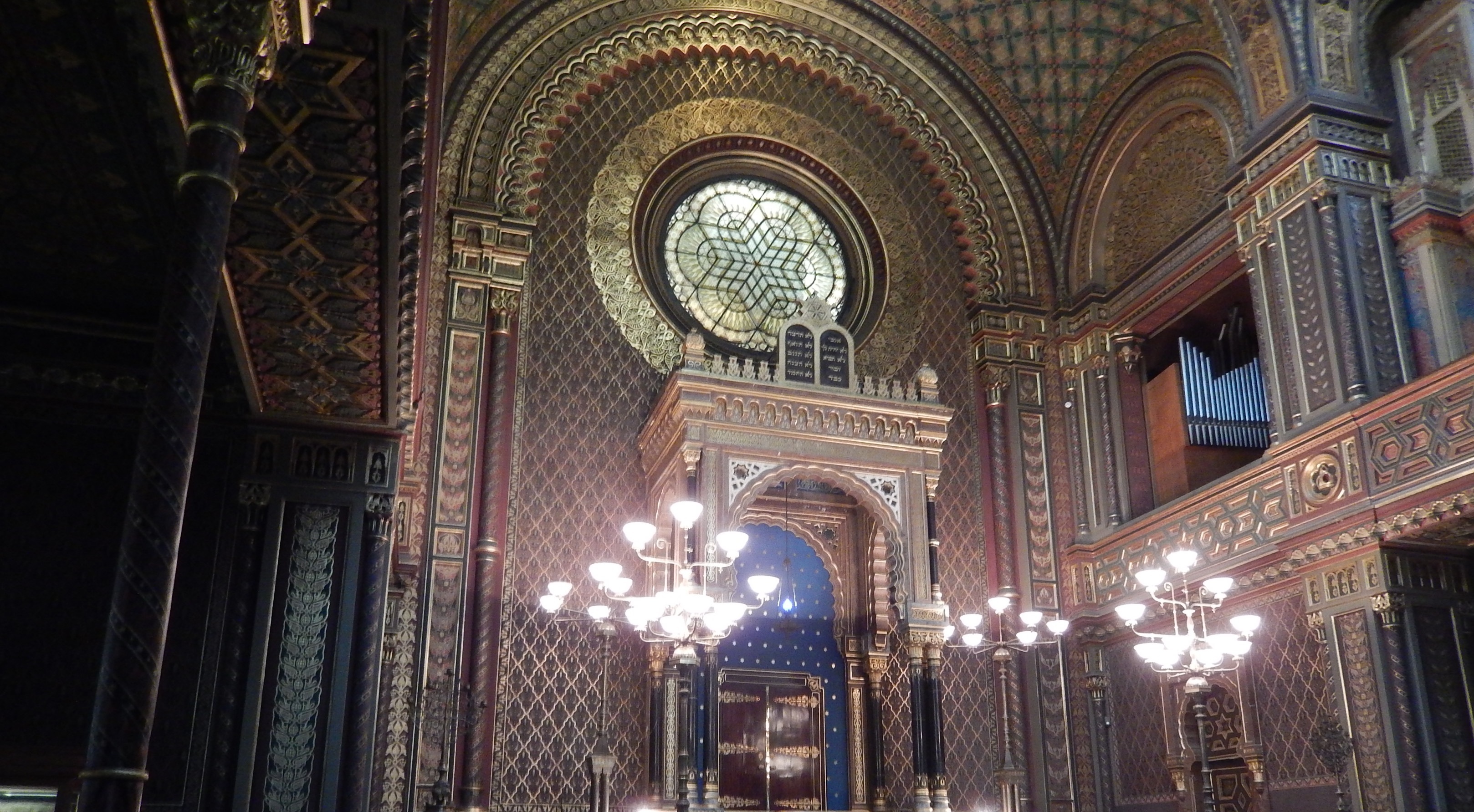 We didn’t tour inside the six remaining synagogues. However we did attend an evening concert performance in the Spanish synagogue, built in 1868 in Moorish design. It is impressive, as you can see from the photographs. Note the highly detailed gold mosaics, which have a distinct Islamic motif feel. There is also a small exhibition around the walls of the interior. This exhibition traces the way of life of the local Jewish population and displays many precious artefacts.