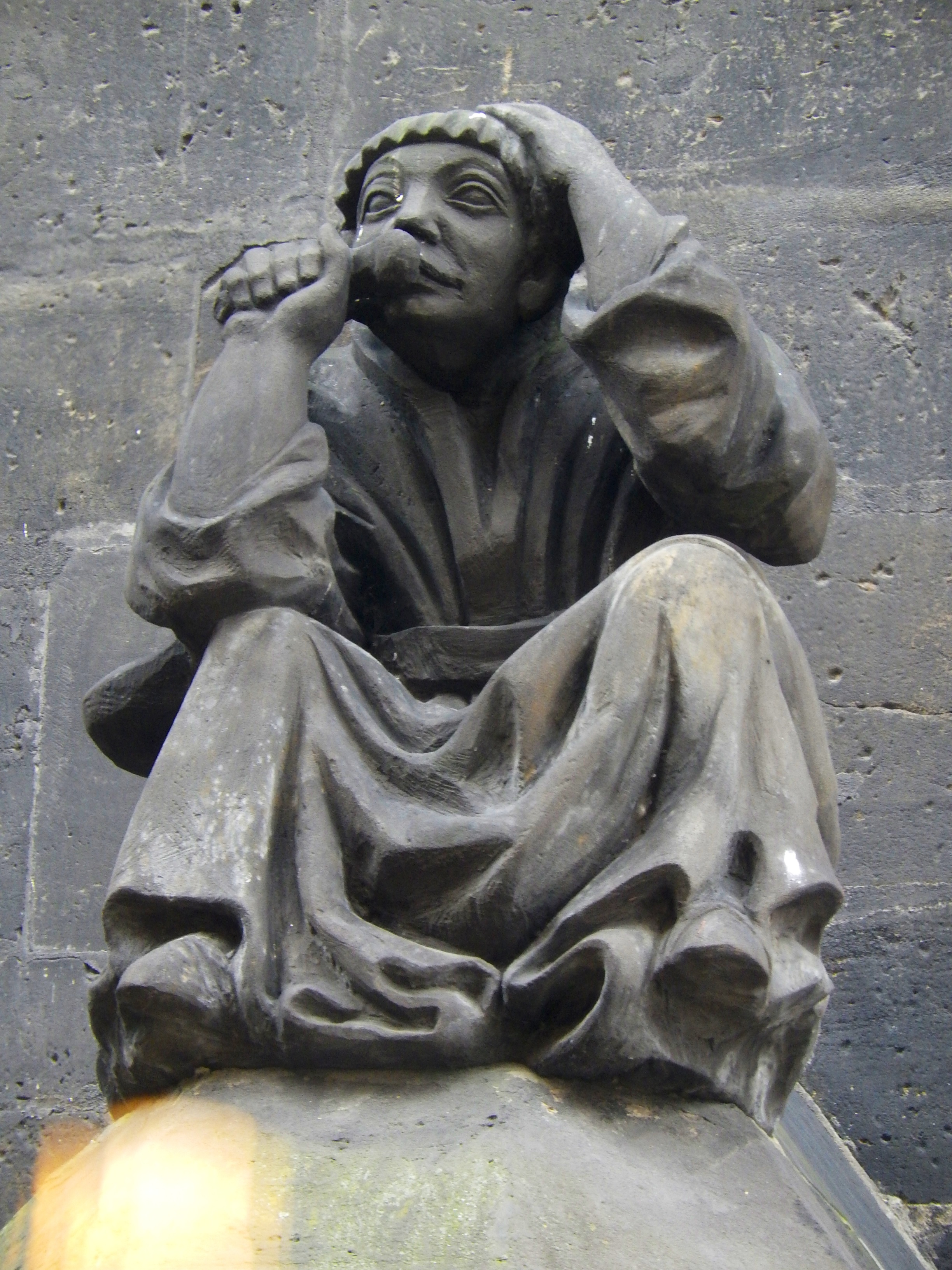 At one stage the tower was used to store gunpowder, hence its current name. Wikipedia says it suffered “considerable damage” during the Battle of Prague (1757). Our guide said it ” blew up”, and afterwards the decision was taken not to store gunpowder so close to the city. (Ya’ reckon?) Let your own imagination decide the extent of the damage. Anyway it was rebuilt, and more decorations added about one hundred years later. The photo on this post of what looks like a puzzled monk eating a chicken drumstick is one of them (taken from a second story window of the adjoining Municipal House).