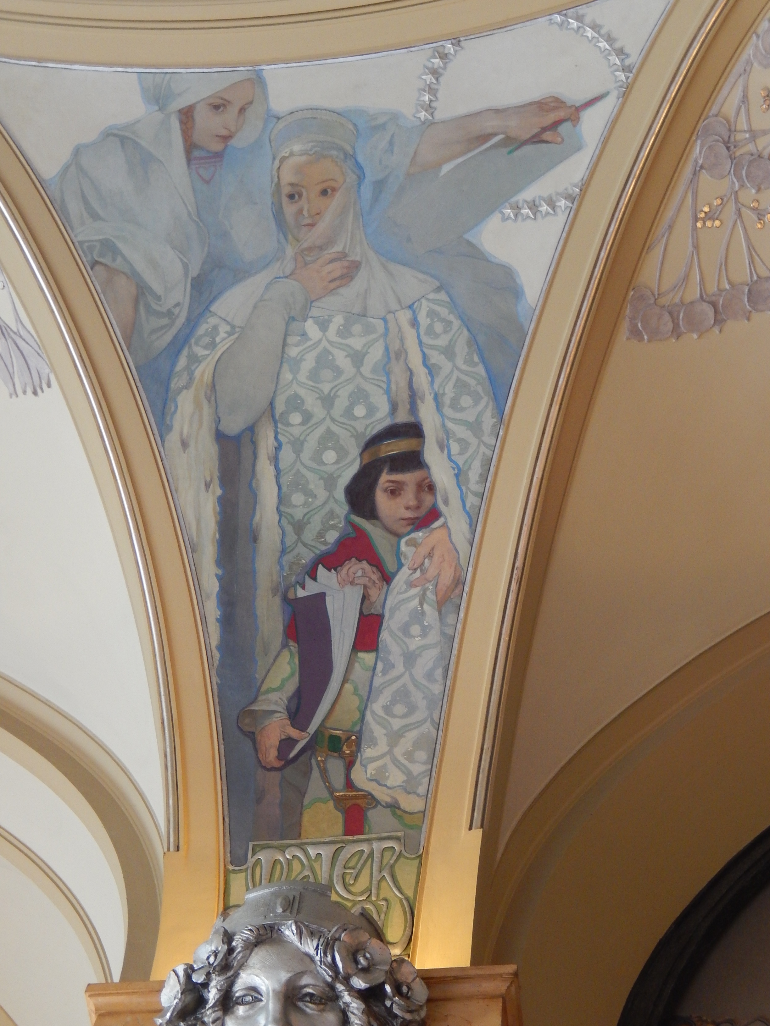 The tour starts in the Smetana Hall, named after their great composer, and housing a magnificent organ which famous persons have played. The hall is richly decorated with allegorical frescoes (music, poetry, art and so on). There are special boxes for royalty and others of the well-to-do.