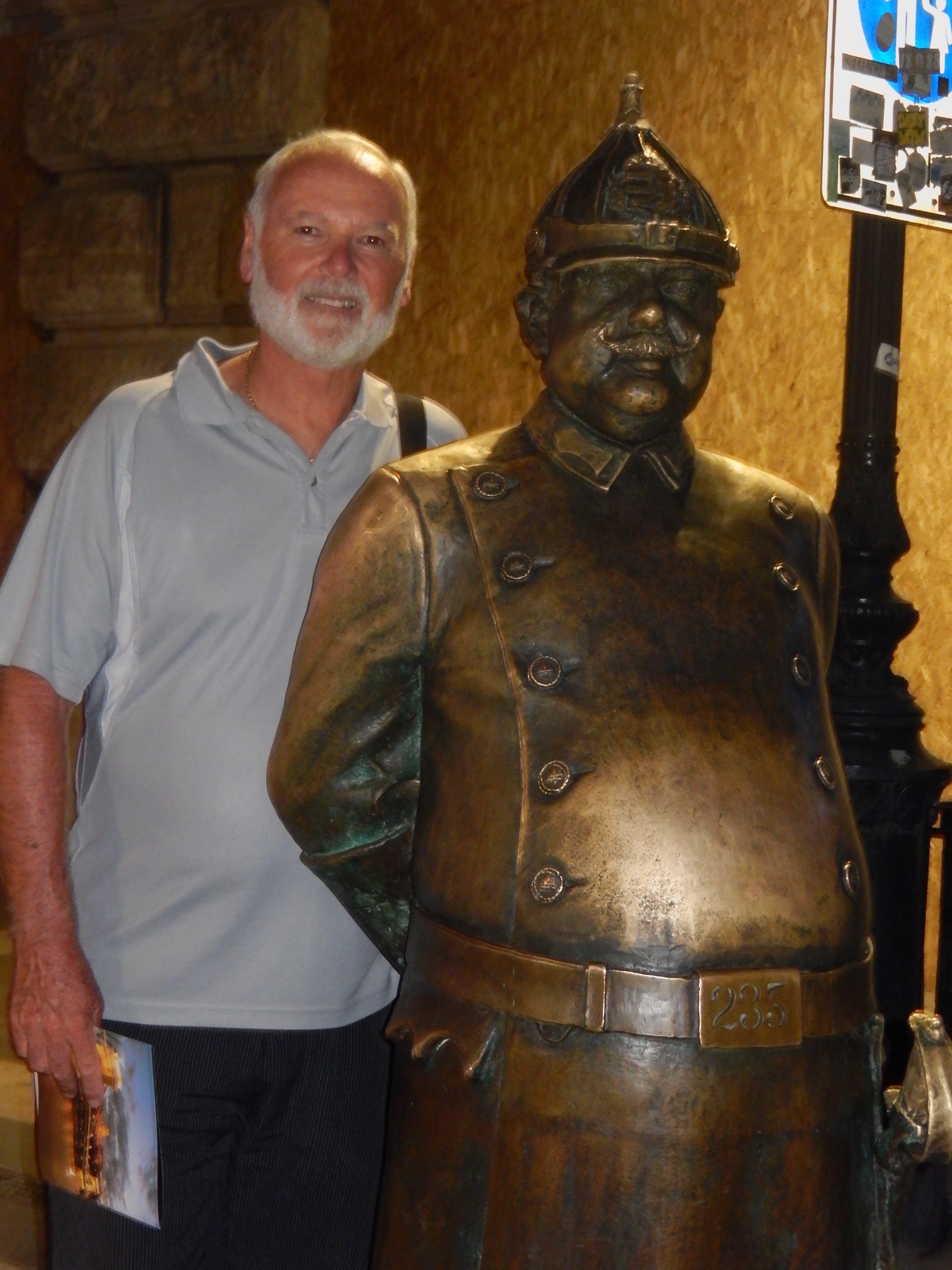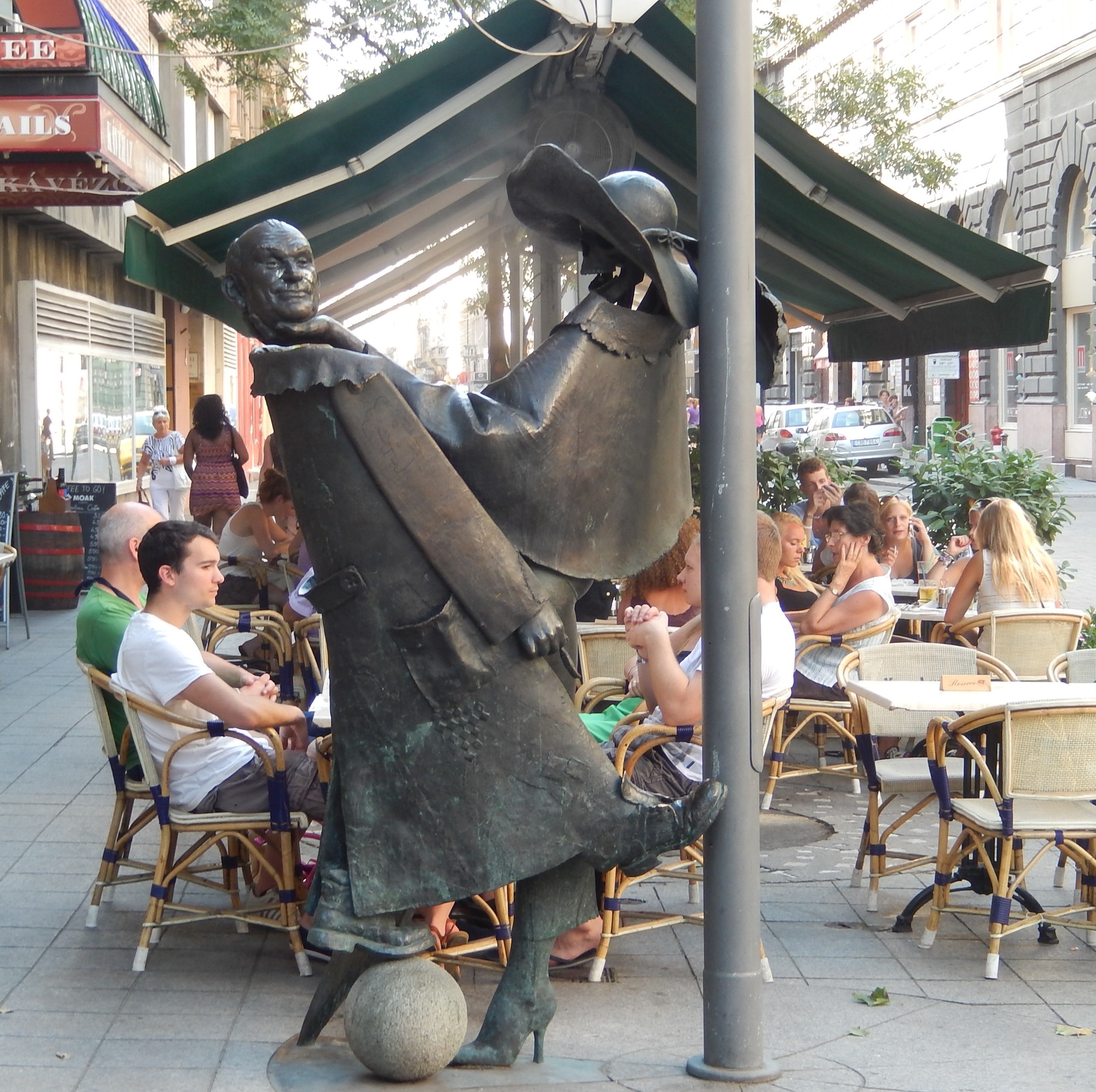 In the side streets between the Opera House and the Octagon Square we found what appears to be the theatre district. Lots of outdoor cafes and posters advertising theatrical events. It was all very lively. We also discovered that Budapest has many statues, both upstanding examples of famous people in their history, and fun ones of comic relief in the theatre district.