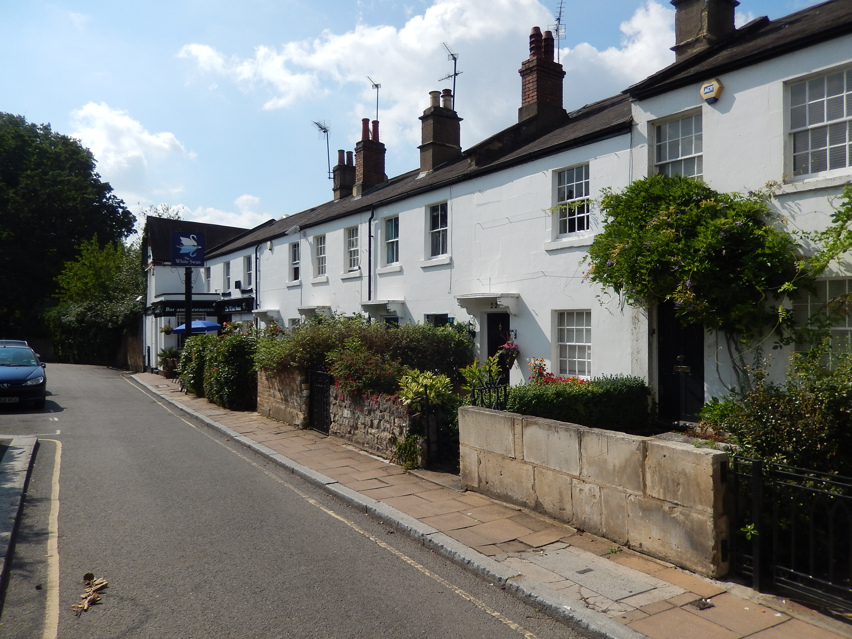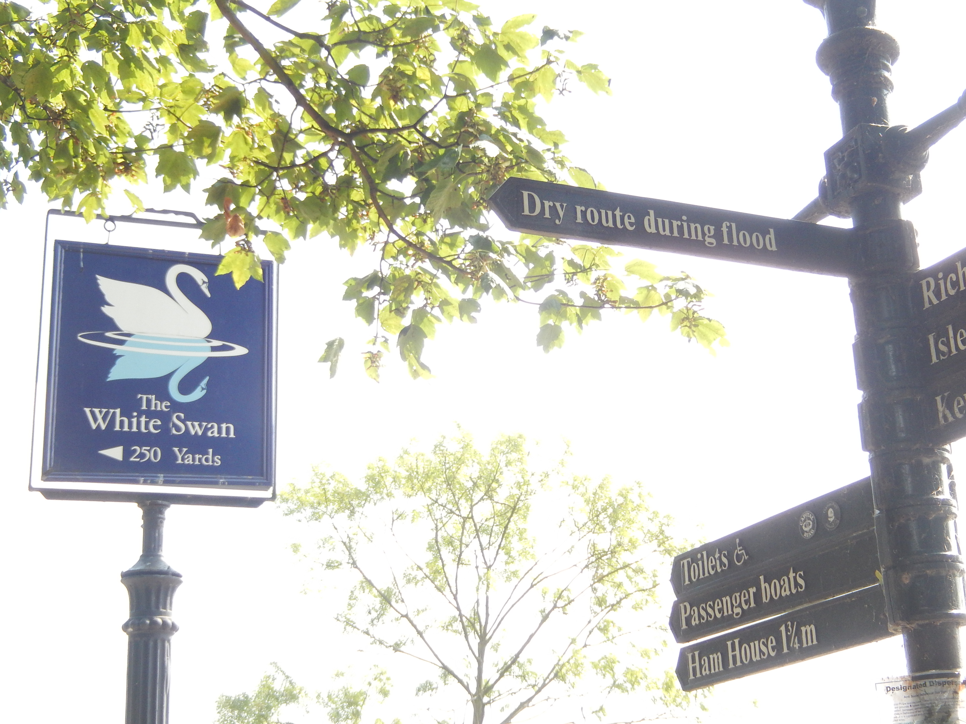 Then we continued along parallel to the river, following a path that led to an extremely large park, which I assume was Richmond Park. We only peeked inside, as we were conscious of time marching on, and besides, we were getting hungry and thirsty. As we turned back in the general direction of the main street, I noticed this sign that appealed to my warped sense of humour. Do any others see the irony in a “dry” street having a signpost to the local pub? Anyway, I can vouch that the pub definitely serves alcohol. I was ready for a refreshing cider (and a loo stop :-))