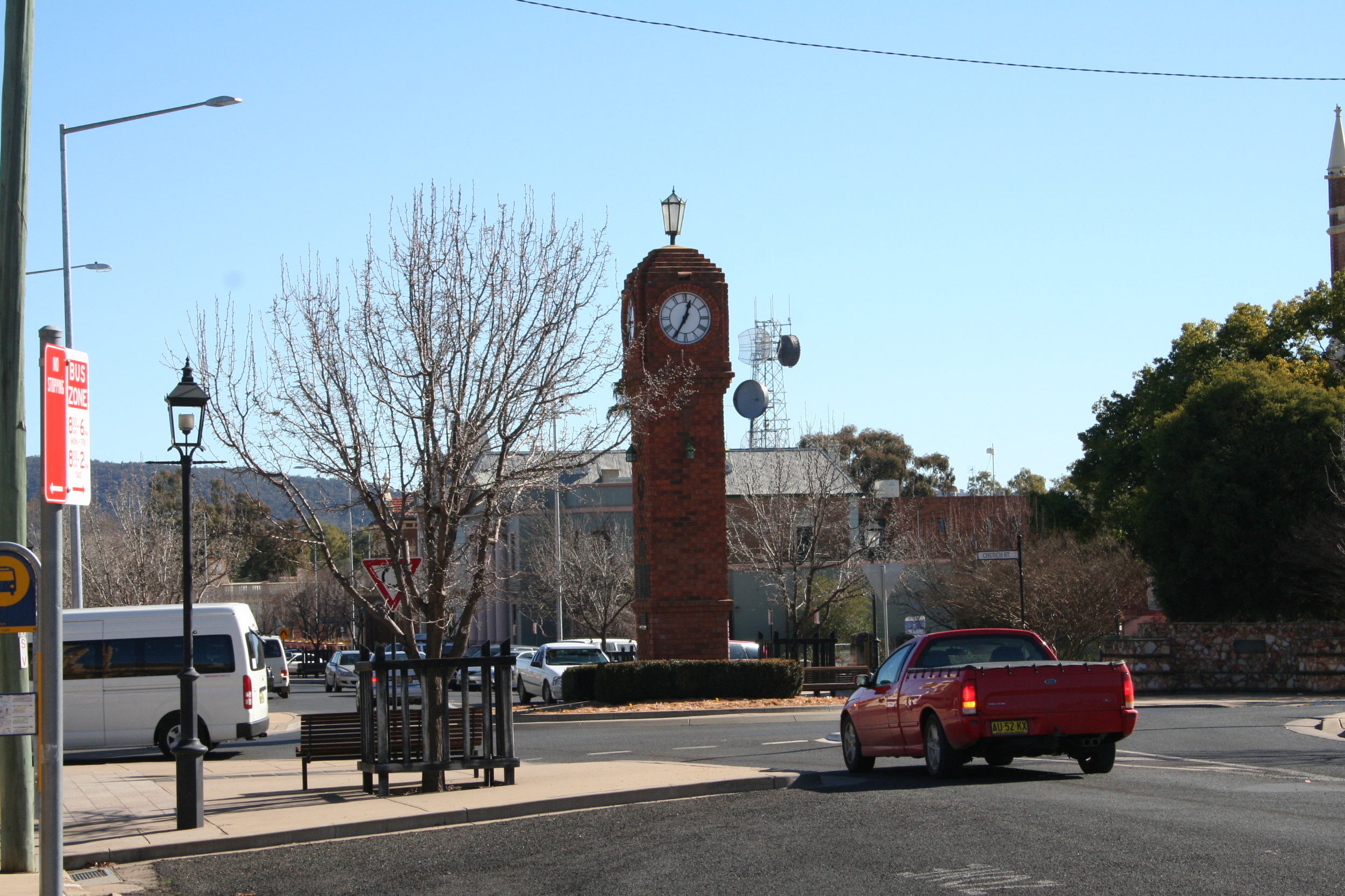 In the middle of the cross-road there is a monument with a clock tower at the top that serves as the war memorial. Standing here and looking east-west or north-south, one gets a good view of the commercial length of Mudgee, and it is striking to notice that the township is surrounded by green-brown hills on all sides. It is a little oasis of stability cut from an expanse of scrub and bush.