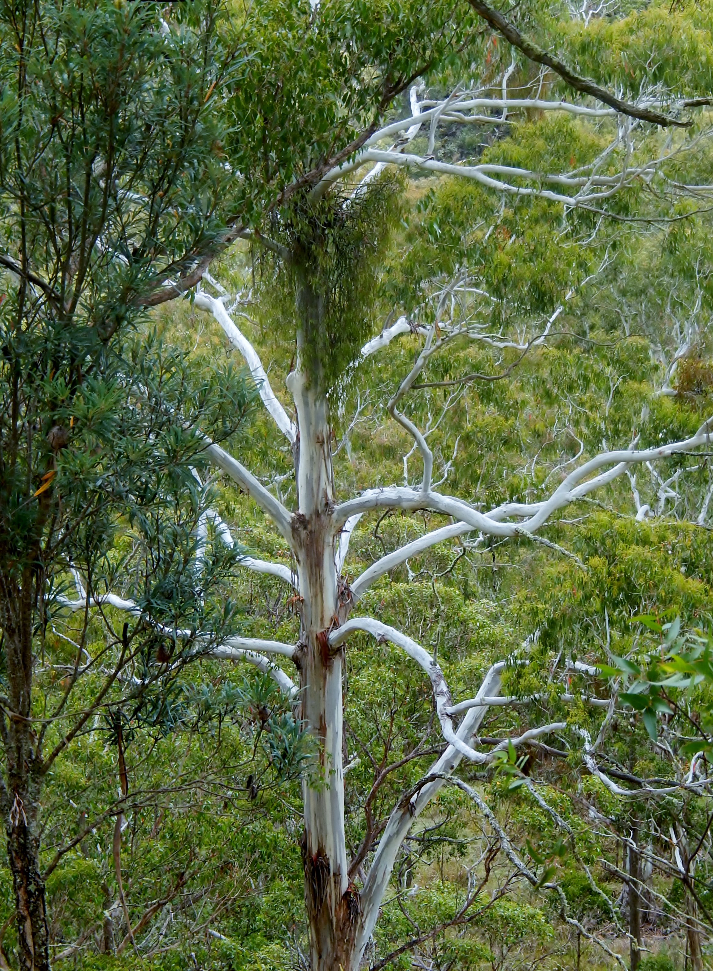 “You had a picture of a Ghost Gum/White Gum, I just thought I would let you know on our travels we learnt that there is a parasite attacking our native Gums you can just see it on you picture, it looks like a large cluster of leaves, apparently birds carry this parasite from tree to tree and is decimation our Gums, when you drive anywhere you can see these clusters and the damage they are doing. She thinks it is called a mistletoe.”