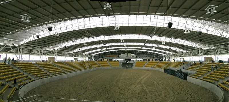 Well, we passed on that one, in favour of going to the Australian Equine and Livestock Events Centre (AELEC). This is a huge, state of the art complex of stadium, stables, stock holding, and camp accommodation and bathing facilities for horse and livestock shows. Our visit co-incided with the Minature Horse competition. We were fascinated to watch the show-jumping, segregated according to height of the horse. Whichever, way you measure it, these horses are tiny, and the ‘rider’ runs allows beside the horse, communicating via a leash to encourage it over the jumps. Unfortunately – ‘one’ of us left the camera back in the car, so no photographs, but thanks to Wikimedia commons, I can show you one of the stadiums: