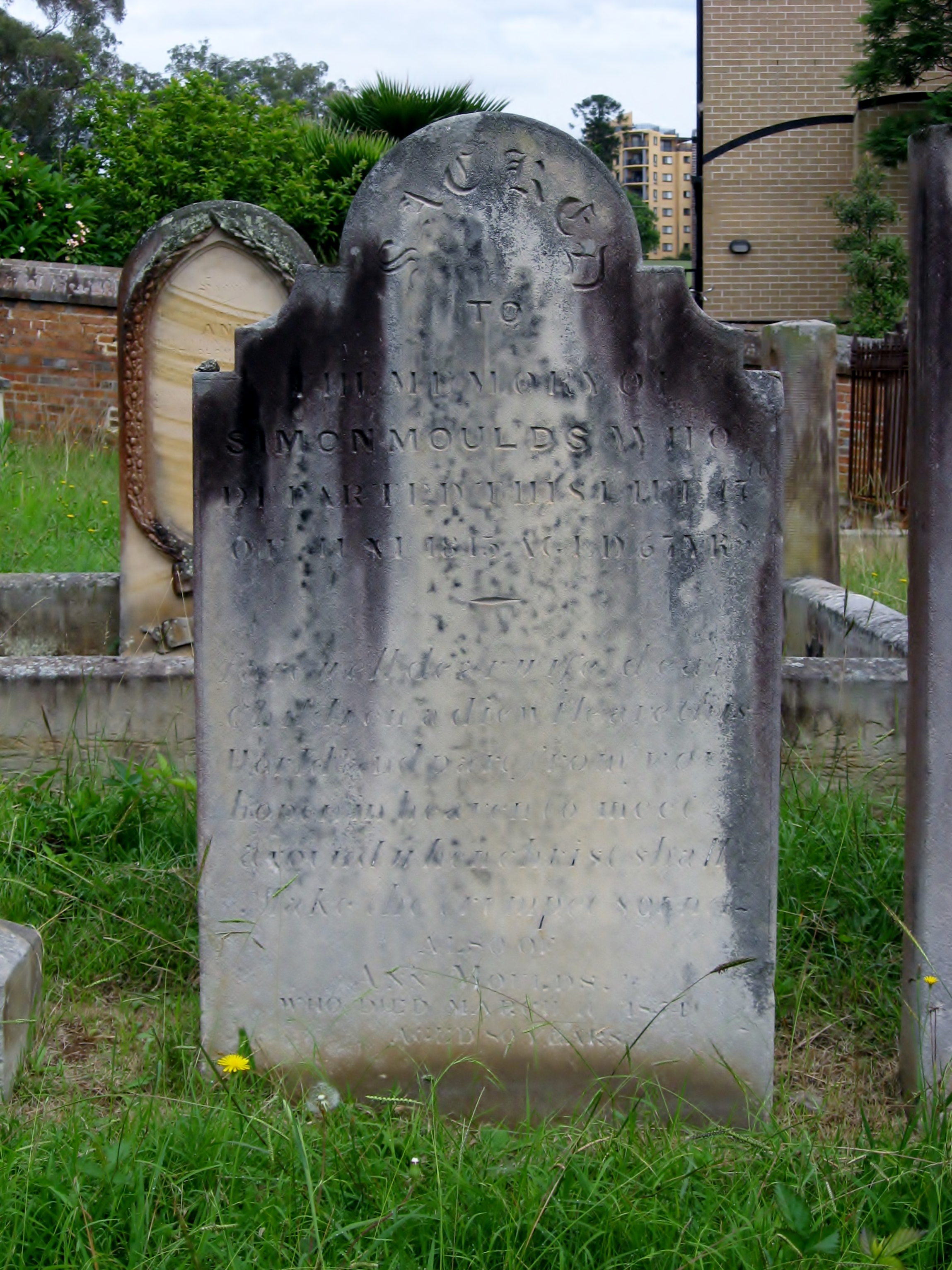 Bill’s ancestor came from the west country, and at the ripe old age of 15 Ann Davis was arrested in the parish of St George’s in Gloucester for pawning goods that did not belong to her – a gown, skirt, five caps and other items of clothing. She risked being sentenced to death for burglary but the jury convicted her only of theft and sentenced her to seven years transportation. From Lent in 1788 until mid March of the next year Ann languished in Gloucester Castle Gaol before being transported. She eventually “made good” in the colony and died in 1854, aged 80 years. By that time, she was the widow of Simon Moulds. He died before her, so gets most of the glory on this headstone, but she is mentioned right at the very bottom, just above the grass.