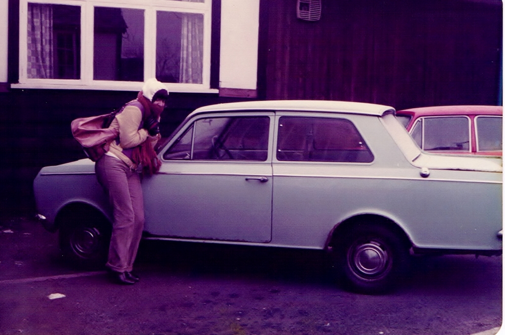My friend Wendy standing beside my “new” Vauxhall Viva 1966 model. It was light green in colour. Possibly her Austin in the background. Taken at YWCA Wolverhampton in November 1978. Our first winter outside Australia.