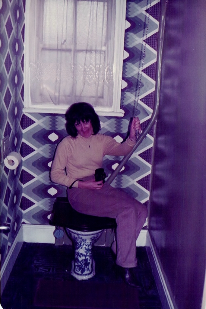 The next day we drove Wales south to north, and as I wrote to Mum, ‘there’s a green land for you,’ but as well there was a lot of snow around and it was bitterly cold. In the afternoon the other two dropped Wendy and me at the YWCA in Wolverhampton as it was the closest to Stafford on the route we had taken. The accommodation turned out to be so nice and so reasonable that we based ourselves there for a few days. We were very taken with the “facilities”, as you can see from the photo modelled by Wendy.