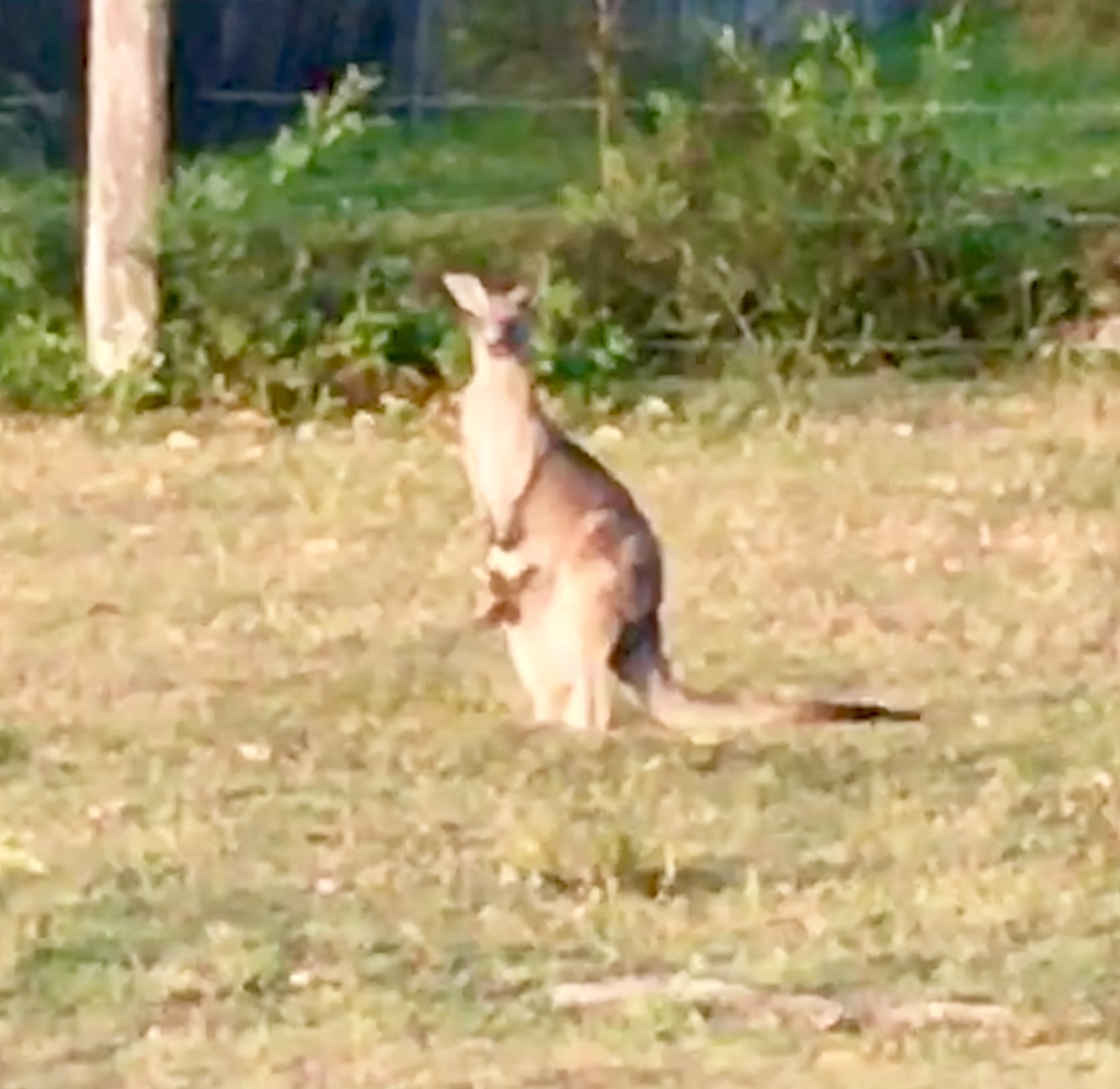 The joeys in the pouches of the kangaroos on this property are much further along in their development. Every so often a head pops out, or more likely, it does a tumble turn and the legs stick out the pouch, while it’s head down suckling on the teat. You can see a joey’s head peeking out of the pouch in this blurry enlarged photo . . .