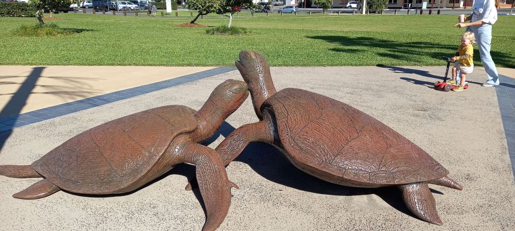 So on this, our first morning, we had a lazy start. I sat up in bed and finished Ursula’s Story before we wandered off for a late breakfast at the waterfront. We chose the Blue Marlin Bistro, one of the restaurants in our discount voucher book and it sure was busy! We were kept amused as various missing items came to our table as they became available from the dishwasher. At first there were no water jugs, and then no glasses, and finally no cutlery. But we got there in the end and my Eggs Benedict was very tasty, and Bill enjoyed his scrambled eggs with spinach and smoked salmon.