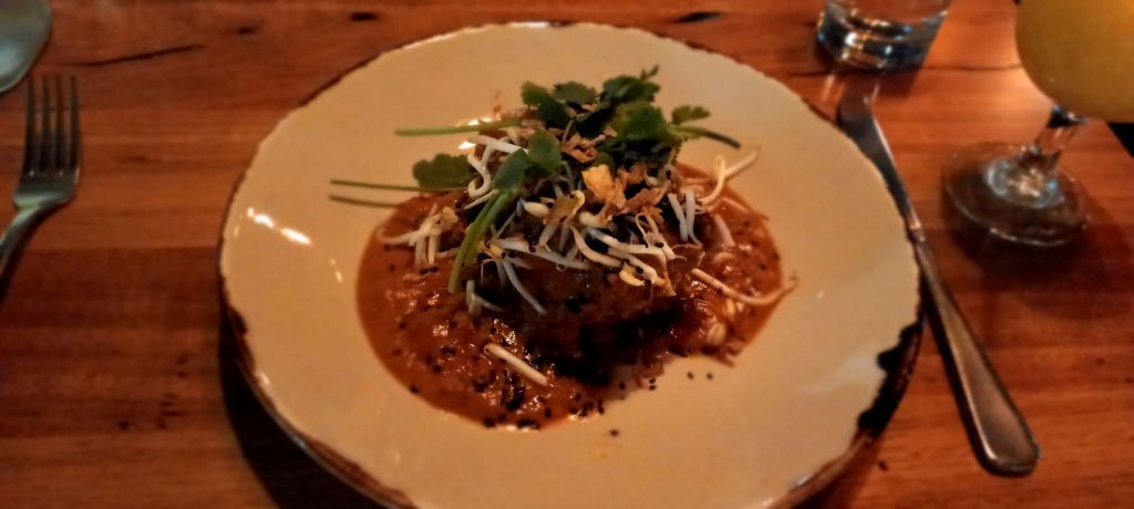 Suitably refreshed, and having burnt no calories for the day, we then headed off for a “two-course dinner with welcome drink” that was also included in our holiday package. This was at the Ochre Restaurant, one of the string of restaurants lining the harbour foreshore. My mango daiquiri was served frozen, so that occupied me drinkwise for the entire meal. Of a choice between beef carpaccio and coconut prawns with kimchi side, we both chose the latter. For mains, Bill had prosciutto wrapped chicken breast and I tried the beef cheek in coconut red curry sauce. All very nice, but the a la carte menu also looked appealing.