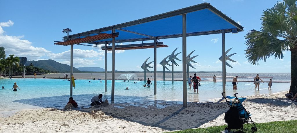 Then we wandered around to The Lagoon, the saltwater pool we’d seen the previous evening. Bill enjoyed a couple of dips, and I managed to walk in part way, but I am not much of a water babe. It has to be very hot for me to brave the cool water, and even though we are in the tropics, it is “winter” so mid-20s Celsius does not crest my bar. One year, though, when we were in Hawaii, I just about lived in their bath-temperature water. I returned home many shades darker.
