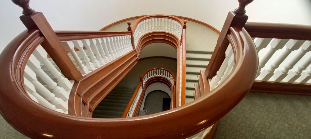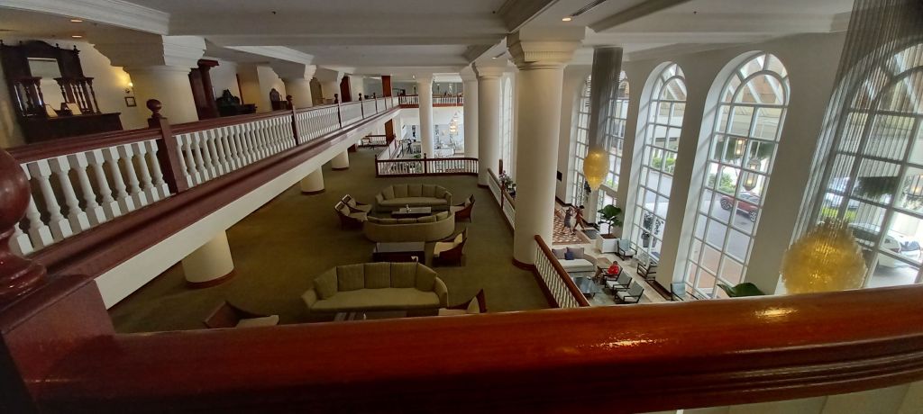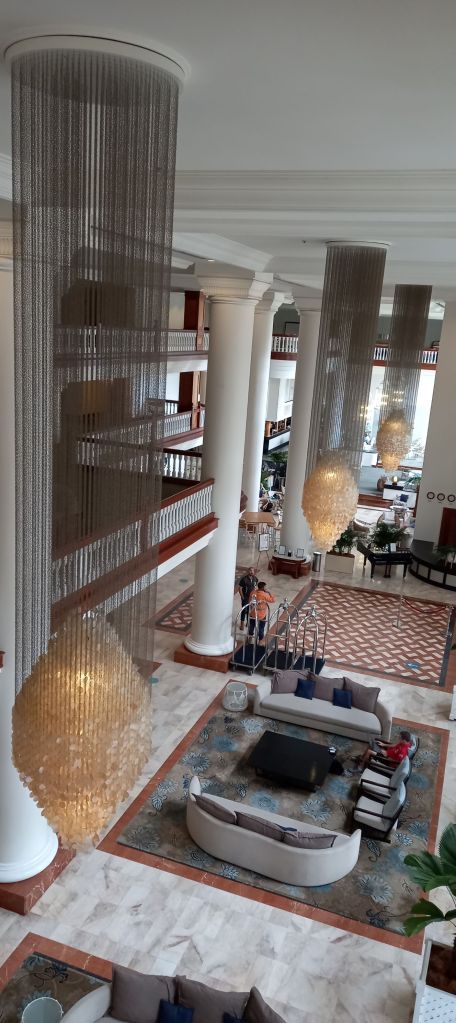 As part of this holiday package that keeps on giving, the next inclusion was a one-hour massage for two persons in the hotel spa. Even though every time Bill complains of aches and pains from golf I recommend he have a remedial massage, this was his first experience. We donned our hotel robes and slippers and went down the second level. Because of the hotel refurbishments making things a bit noisy during the day, the spa was not opening until later. Our booking was for 6pm. While waiting for our turn, I snapped off a few photos of the magnificent lobby and staircase from this elevation.