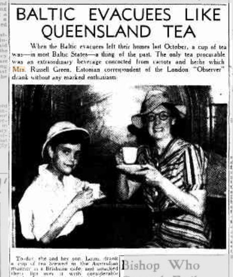 Mrs. L. Russell Green, the Estonian correspondent of the London “Observer”, arrived in Brisbane with her young son, Louis. I include a newspaper photo of them “enjoying Queensland tea”. She gave many candid interviews, and then disappeared until around 1948, when she turns up in the Queensland country town, Charters Towers, writing entertainment reviews for the newspaper The Northern Miner, and possibly teaching there. The next year she presented a talk to the Central Congregational Women’s Guild in Ipswich about her experience in Estonia. It makes great reading, and you can find it here. She says, “The Russians are the greatest nation of actors in the world, and that is why they have been able to make their stupendous propaganda so convincing.” This presentation also reveals she has a teaching position as music mistress with the Ipswich Girls’ Grammar School.