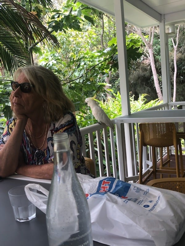 As you can see, the café where we met for a coffee, and, in our case, a shared light lunch for my sister and I, was outdoors, in a converted weatherboard house newly built kiosk* (see Chris’ correction in remarks) with a wraparound verandah surrounded by lush coastal trees and palms. Those who remember my recent posts regarding naughty cockatoos will be delighted to see that one cheeky fellow joined us in the hope we would share our lunch with him.