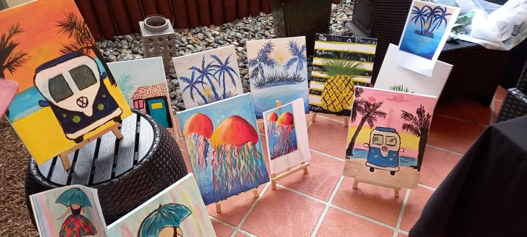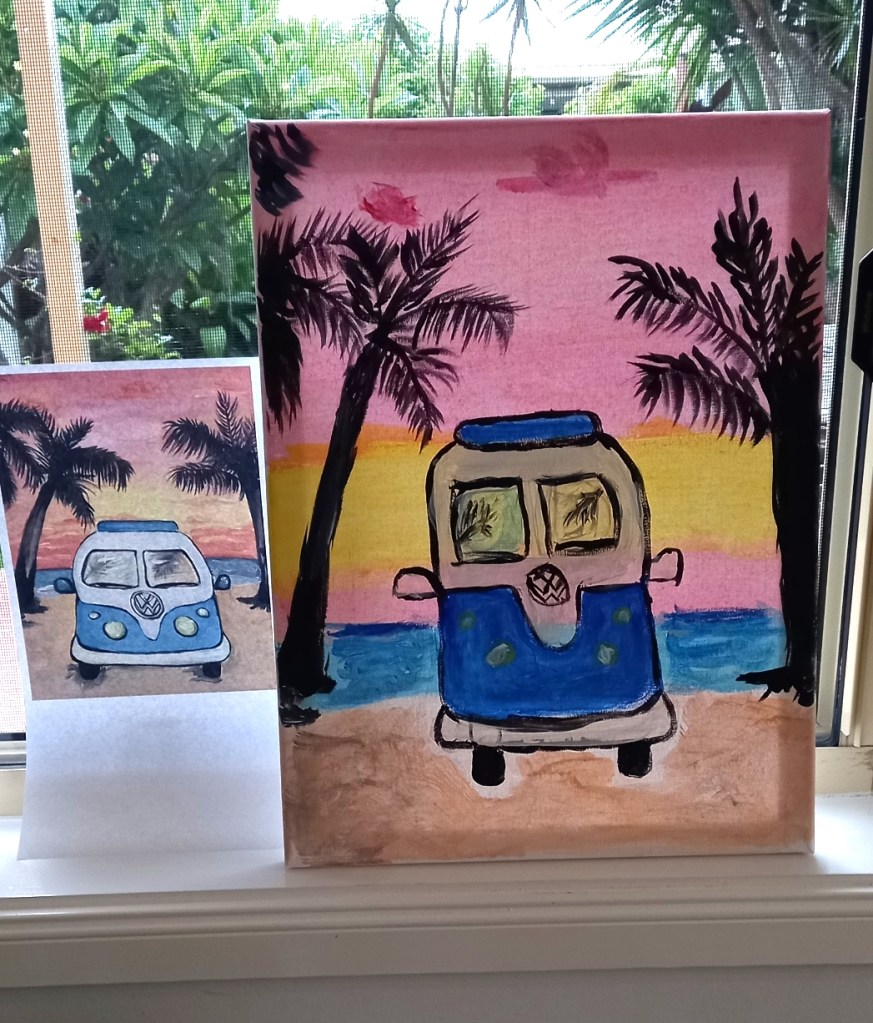 We wrapped it up after an hour or so, so we could have some nibblies. I could have continued, because I was in the swing of it by then and finding that actually, I wasn’t as rubbish as I always thought. Not great. But not abysmal either. But others produced some outstanding results and were much faster than me. Here’s some photos to give you the idea. In the below photos, the original of the jellyfish, and the girl with umbrella is displayed beside the painting and you can see those artists got very close to the real thing. Birthday sister painted the blue palm trees on the back left, from the original on the far right. My nephew and I both chose the Kombi van. The painting on the left is his effort, and mine on the right. My stepmum did the pineapple that is on the white canvas. She didn’t get the memo about painting a backwash first 🙂 . Bill’s is the one peeping out from the rear. I’ll have a better shot further down.