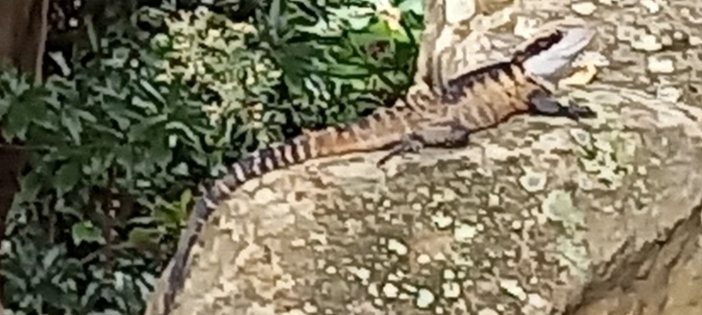 Beside this weir is, believe it or not, a gym – some of which is under cover, and some is semi outdoors. This is where Craig’s partner comes to maintain her trim and fit figure. Often times, those exercising are observed by the local lizards as they sun themselves on nearby rocks, and they too, can be rather fit and bulked up, as this out of focus zoomed-in shot from Bill’s phone camera demonstrates: