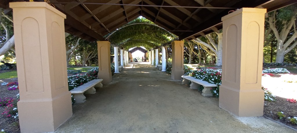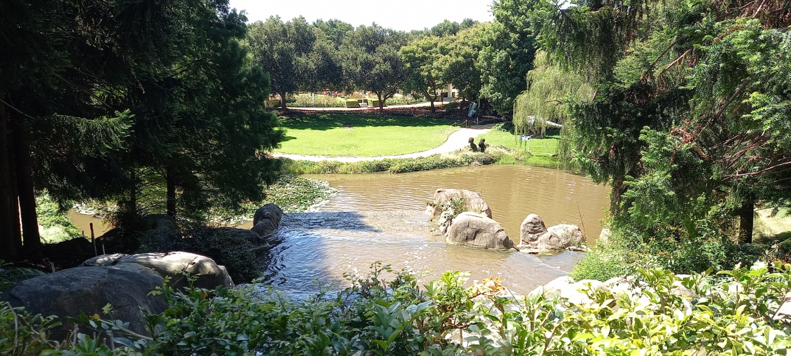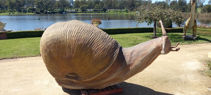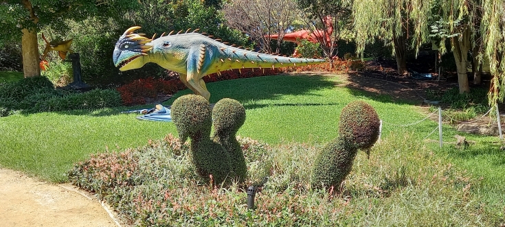 It’s been a challenge to decide which of the hundred or so photos we took on the day to use. To add appeal for the many children who are brought to these gardens, a temporary display of mega creatures was on show. I left Bill to photo those (shoot seem the wrong word to choose under the circumstances), and will include a sample at the end. For now, I will take you along as we discovered the layout. Most descriptions below are from the website.