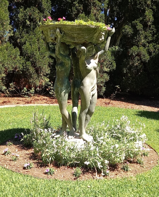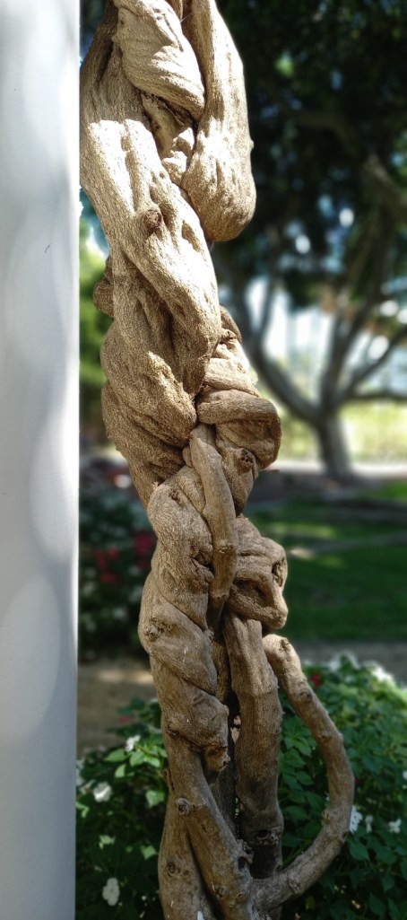 This part of the garden is popular for weddings, and I can picture the groom waiting as his bride comes down the walkway covered with wisteria. Or the two of them walking back towards the three nymphs holding up a basket of plenty (my words – not the website’s 🙂 ) In lieu of actual the flower, I offer here a photo of a tortuous wisteria trunk 🙂