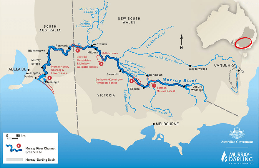 The Murray is Australia’s longest river, being 2,508 km (1,558 mi) in length. It rises in the Australian Alps (Australia’s highest mountains), drains down the western slopes, and then meanders northwest, forming the border between the states of New South Wales and Victoria, and then flows on into South Australia where it drains into the sea near the Coorong (as in the 1976 film Storm Boy if you have seen that). Along the way, several important tributaries feed into it, the most significant being the Darling River, which rises near the New South Wales / Queensland border and flows southwest from there. The amount of water it poured in at its confluence with the Murray River at Wentworth is part of the reason that the South Australian Murray River residents copped so much flood damage.
