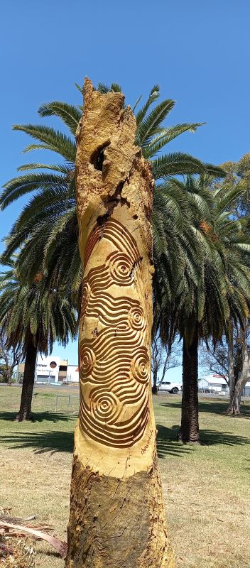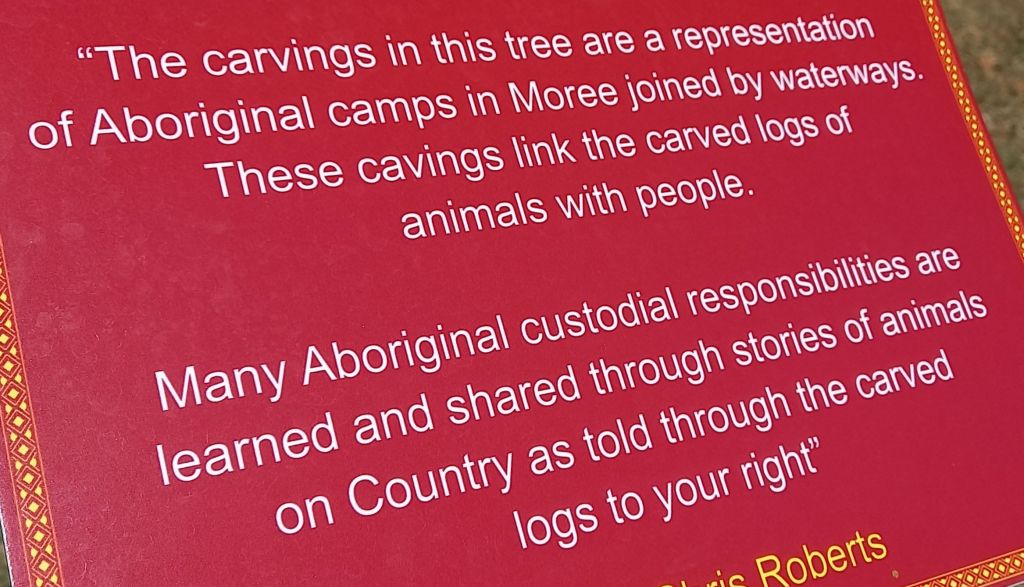 As we strolled back to our motel for a bit of lunch and downtime, we explored art of a different kind by cutting through a park displaying the recently installed Open Space Aboriginal Art Trail which is a collaborative effort of five Kamilaroi artists. I was most taken by the carved logs … and I couldn’t resist taking more pictures of the beautiful gum trees (eucalyptus) in the park.