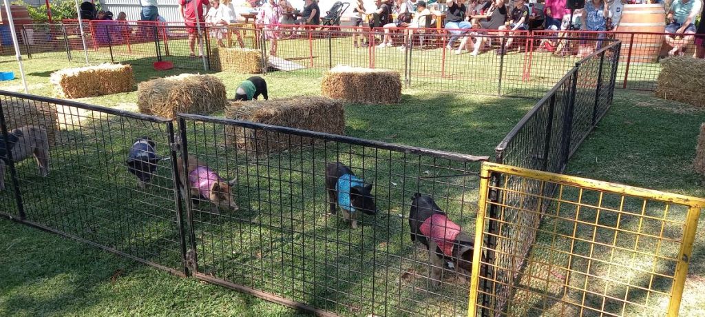 The pigs were enticed around an obstacle course by a trail of some liquid (milk?) until the leader would eventually find a trough of it and they would all pile into slurping it up. The final race we watched required them to climb a hay bale for the yummy prize, and it was amusing to watch them run back and forwards in confusion until one smart one worked out that it was above them. This was a fundraiser for the Westpac Rescue Helicopter which plays a vital role in getting sick and injured people to major hospitals, and we duly made our contribution by buying sweepstake tickets (that did not win) but stopped short at being drawn into the auctions which were going for several hundred dollars a pig (you didn’t actually take the pig home – rather a cut of the winning money pool).