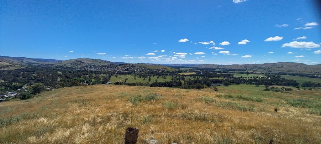 Our last two nights were in Hay, and we intended to have one more overnight stop on the return leg, but, like a horse, once she (or Bill) got the scent of home, there was no stopping her. Each of us taking two x two-hour driving turnabouts, with short breaks for breakfast, loo stops and fuel (diesel), we left Hay at 7.30am and were pulling into the local shops at 4pm. That’s a distance of 692klm/430miles. And we even detoured up to a lookout in Gundagai and then drove around the town a little. This was our last glimpse of the Murrumbidgee River. In the below shot, the green patch in the middle distance is the original location of the town before the river broke its banks in 1852 and destroyed the place. You can read more about that here.