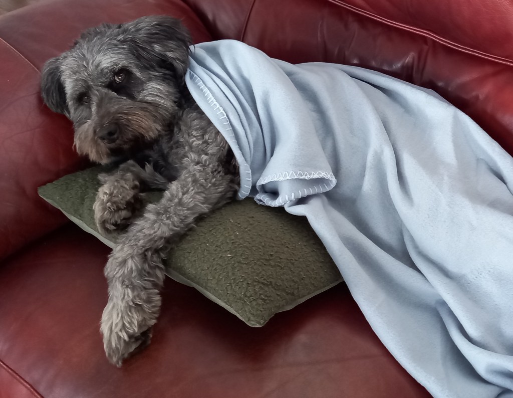 Here’s a picture of me pretending to be exhausted from our walk so Soft Touch could do something called “writing”. I had a perfectly good bed elsewhere, but it was my responsibility to keep her company. She was cold, so she put a blanket on me. Stupid humans don’t come with their own coat.