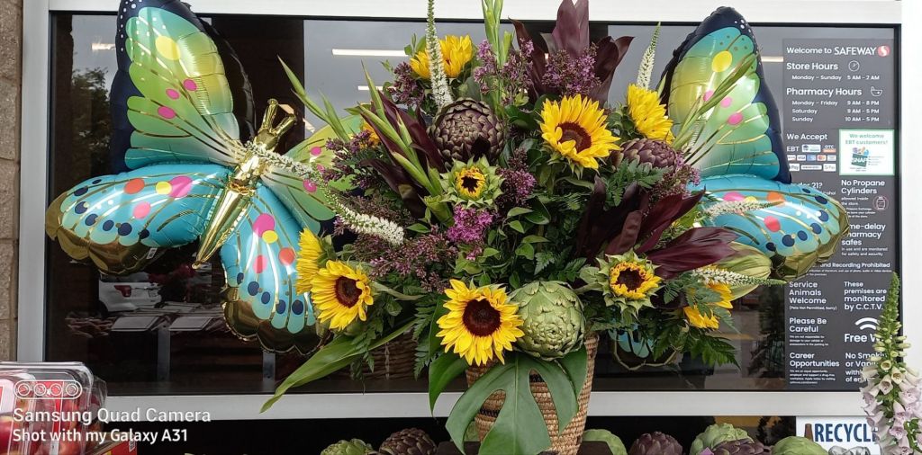 There’d been a lot of sitting so we were happy to stretch our legs for a half hour walk to the Safeway supermarket to purchase a few essentials. At the front door artichokes caught my eye, and just inside it was the flowers which caught my attention. We took our time investigating the various goods on offer, and had a chat with a local lady who initially mistook us for English. I must learn to broaden my Aussie accent into ocker slang.