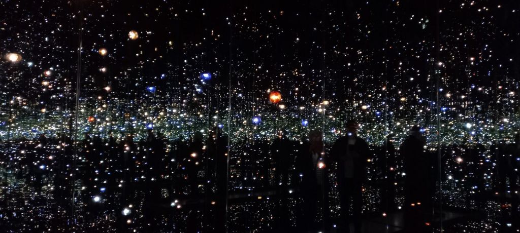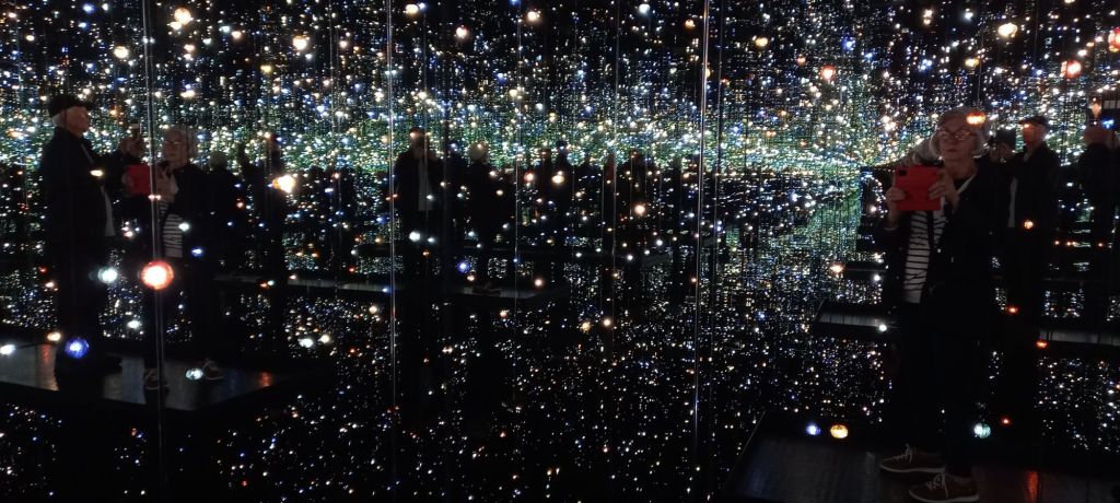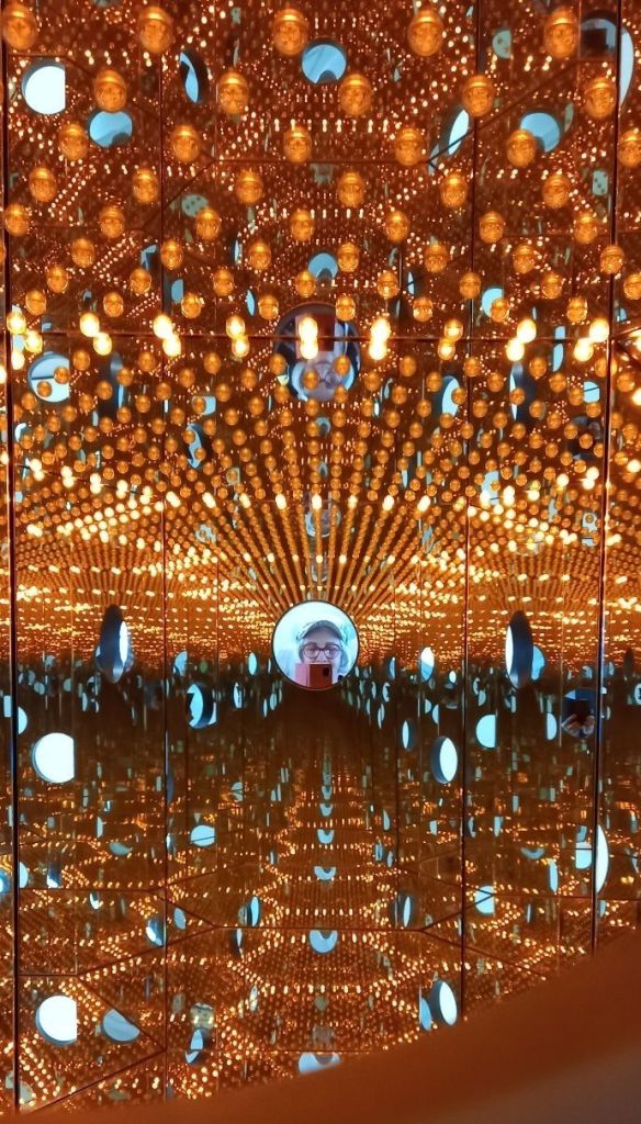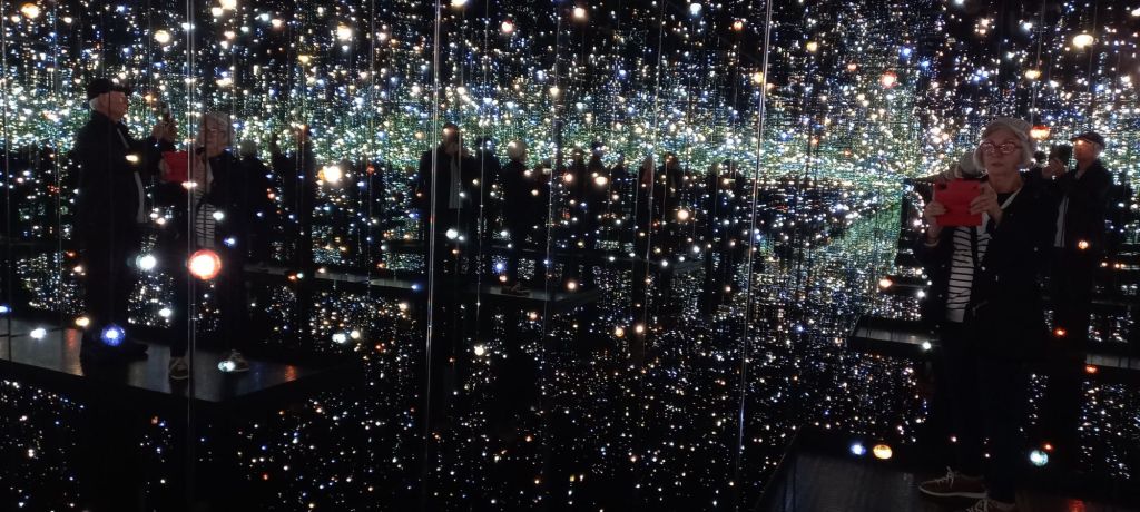 We finished our visit with another of Kurosama’s mirror room installations, the aptly named Looking for Eternity, in which you can see yourself reflected in a changing kaleidoscope of colours.